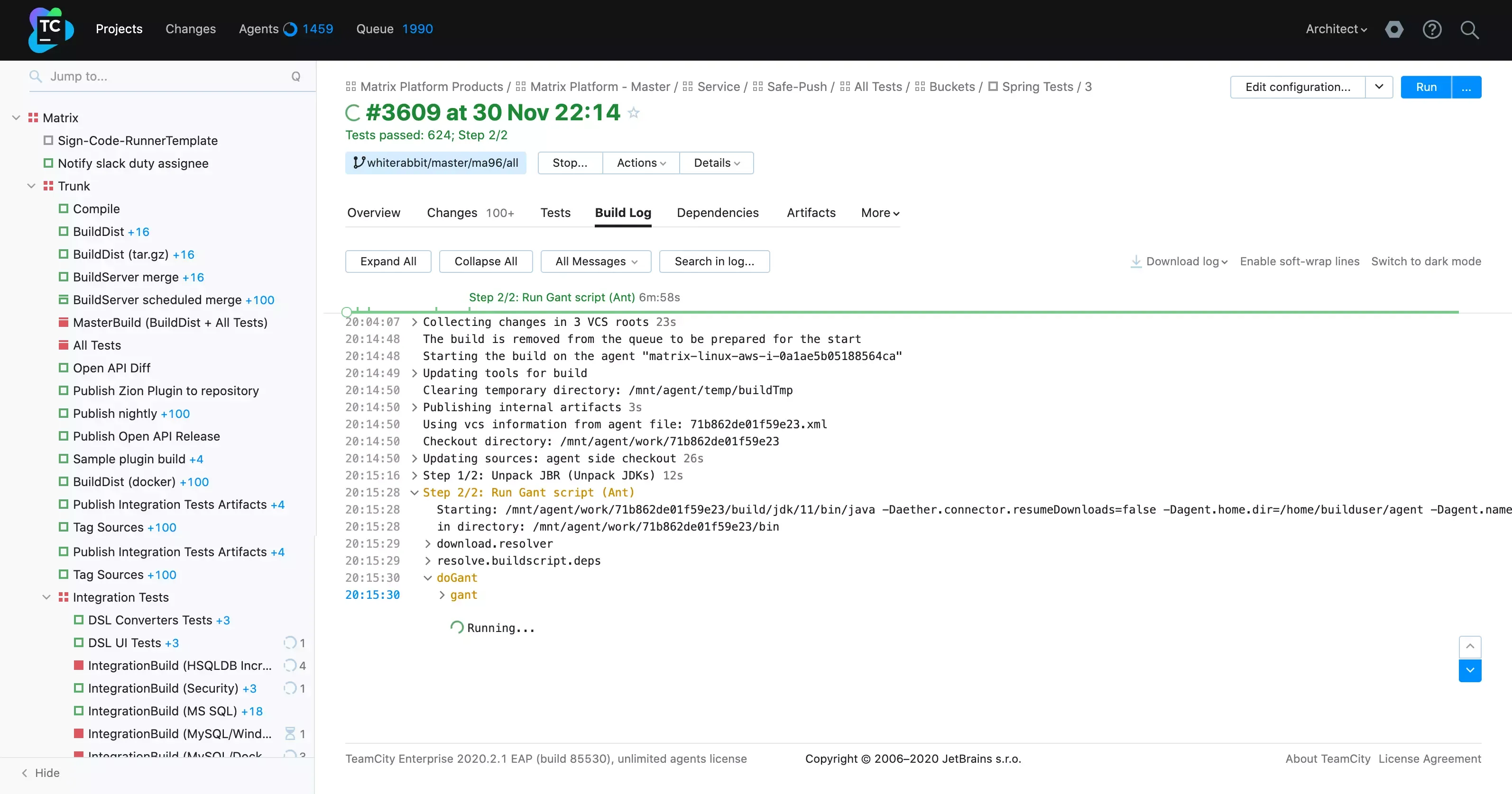 TeamCity non solo fornisce informazioni in tempo reale sui test in corso, ma salva anche la cronologia delle build, registra la durata e contrassegna i test instabili come "instabili". Ogni test contiene una varietà di dettagli come analisi dello stack, screenshot, collegamenti, artefatti di build e log per aiutare il tuo team a indagare rapidamente sui bug. È possibile dare priorità ai nuovi test e ai test recentemente falliti per ricevere un feedback ancora più rapido.