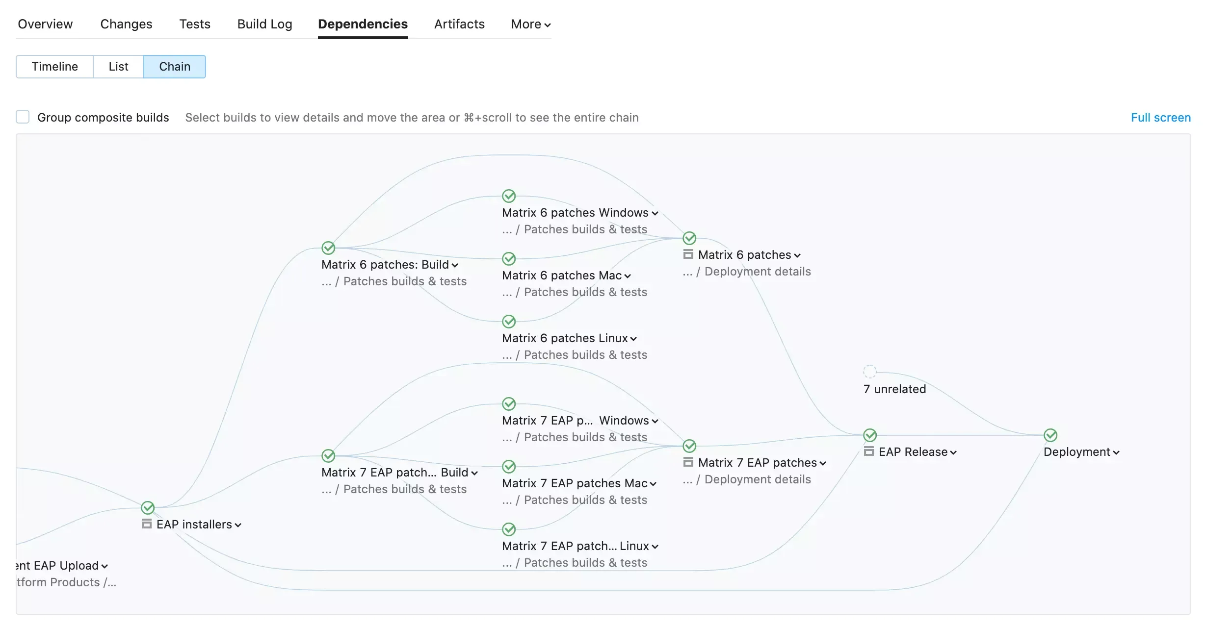 TeamCity porta il concetto di pipeline CI/CD a un nuovo livello. Puoi creare applicazioni con codice sorgente distribuito su più repository, eseguire più build e test in parallelo e sfruttare ottimizzazioni intelligenti che ti fanno risparmiare tempo durante l'esecuzione di build incrementali. Le catene di creazione ti aiutano a strutturare il processo di distribuzione del software. Ciò ti consente di concentrarti sulla scrittura di codice e test invece di collegare diverse parti delle pipeline.