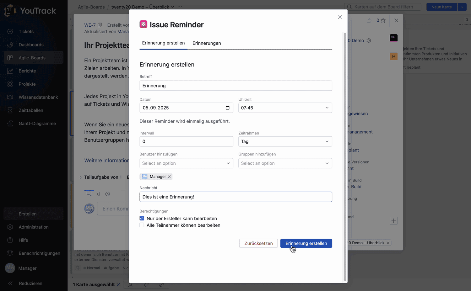 YouTrack offre opzioni di personalizzazione complete e twenty20 fornisce gli elementi costitutivi giusti per questo scopo: dalle app del marketplace alle estensioni sviluppate individualmente, perfettamente adattate alle esigenze dei nostri clienti.